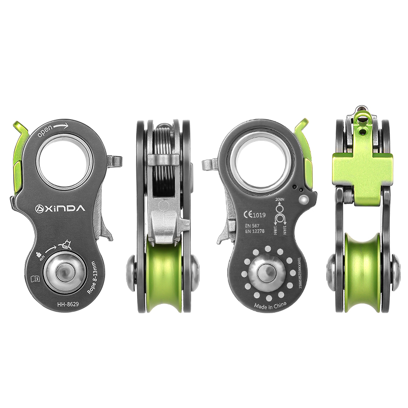 La polea simple/doble ajustable Xinda (modelo: HH-8629, también conocida como "Woodpecker") es un dispositivo de equipo de protección individual (EPI) de alto rendimiento diseñado para protección contra caídas, cruce de teleféricos, transporte de carga, escalada en roca, rapel, protección de equipos, remolque, izado y diversas aplicaciones de sistemas de poleas. Fabricado en aluminio de alta resistencia y aleación de acero, con rodamientos de bolas incorporados, el dispositivo ofrece capacidades de ajuste bidireccional y control remoto, combinando un diseño ligero con una gran capacidad de carga.